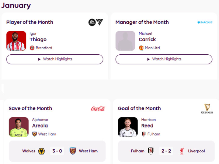 上述三项评比中,曼联方面均取得提名,关联词多古(2项)、库尼亚和拉门斯悉申斥第,只好1月最好主扶助,由两连胜的卡里克当选。其余候选名单,包括3连胜的罗塞尼尔,2胜1平1负的戴奇,3胜1平1负的伊劳拉等四名主帅。