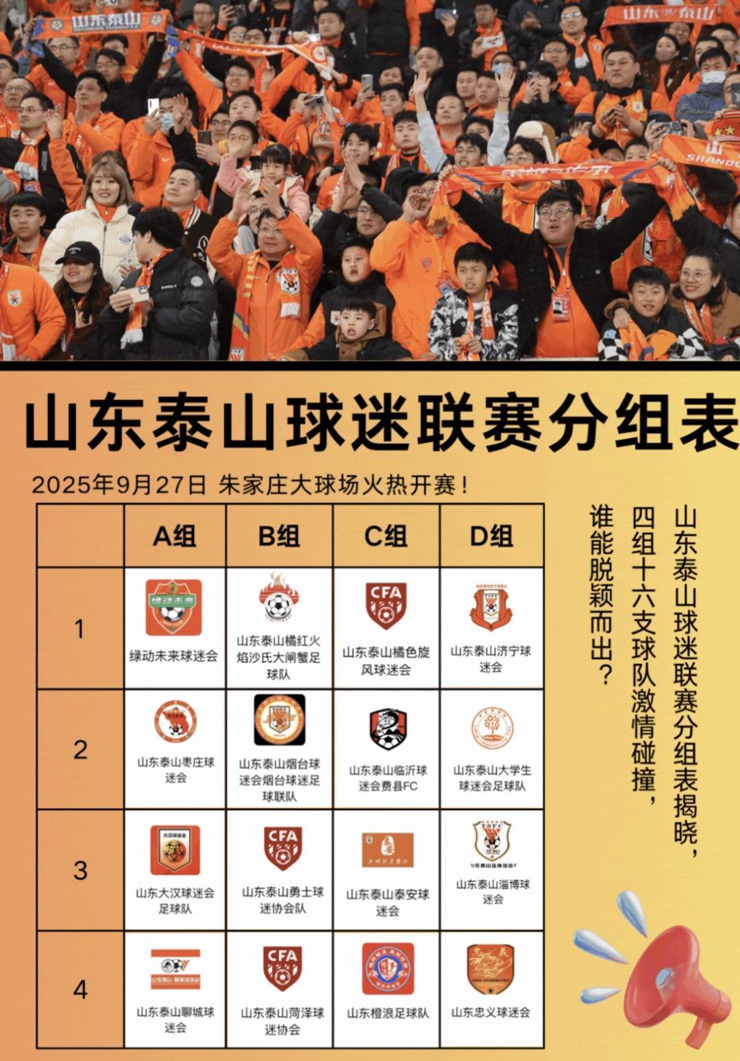 D组:山东泰山济宁球迷会、山东泰山大学生球迷会足球队、山东泰山淄博球迷会、山东忠义球迷会;