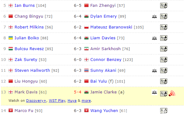 欧洲大众赛冠军范争一则是不时低迷,他在与伊安-伯恩斯的比赛中,一度以5-3得到两个赛点,但在手捏好局的情况下,连丢两局,总比分5-6被淘汰。而上一轮6-0横扫晋级的黄佳浩,在与米歇尔-曼恩的比赛中,3-6被淘汰。