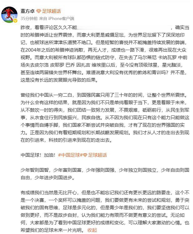 在U23亚洲杯驱动之后,董方卓的言论屡次激励争议。在U23国足晋级淘汰赛之后,董方卓示意体育集锦,“若是按照今天这个踢法,说真话,你能看到中国足球的夙昔吗?仍是看不到。就屎味儿的巧克力,适度是好的。”