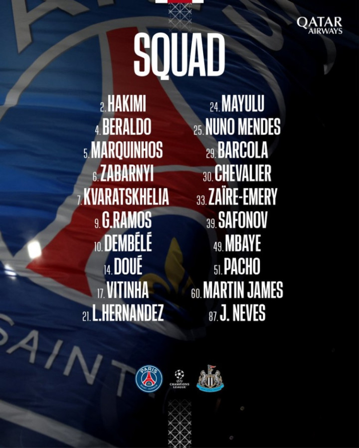 时尚:7-克瓦拉茨赫利亚、9-贡萨洛·拉莫斯、10-登贝莱、14-杜埃、29-巴尔科拉、49-姆巴耶