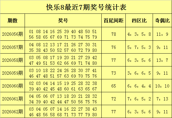 福彩称心8第2026062期开出奖号:03 04 05 07 14 16 22 27 38 43 46 48 56 58 68 71 73 77 79 80,其中奖奇偶比9:11,四区比为6:3:5:6,跨度为:77。